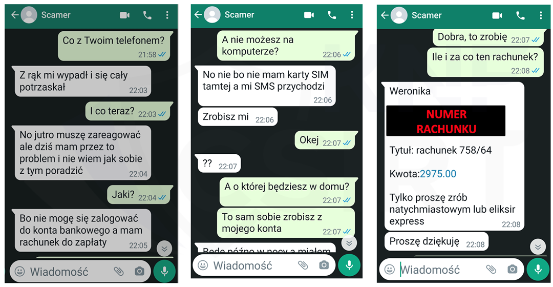Criminals prepared a phishing campaign in which they impersonated a family member. They sent SMS messages, requesting to continue the conversation on WhatsApp. Then, through text conversations, they persuaded the victim to make a transfer to a bank account number they provided. These were bank accounts managed by the criminals.