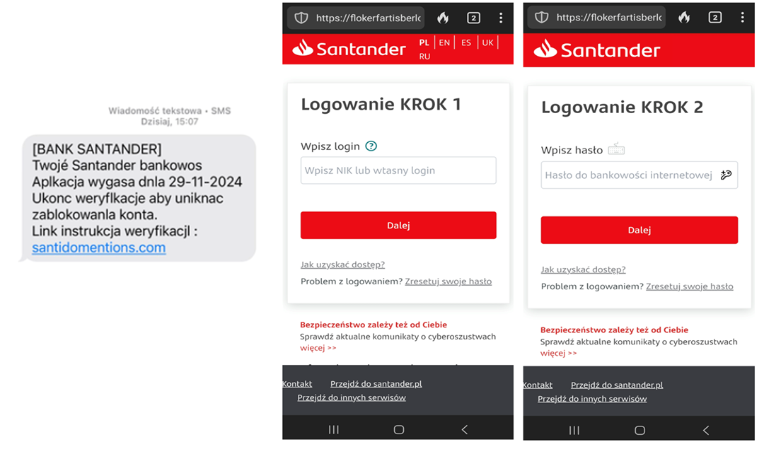 November 2024 was yet another month during which cybercriminals exploited the image of Polish banks to enhance the credibility of phishing campaigns. The attackers impersonated Bank Peako and Santander Bank Polska by sending SMS messages claiming that access to online banking was allegedly about to expire. To avoid inconvenience, recipients were urged to click on a link included in the message. In reality, the link led to a phishing website, closely resembling the legitimate one, aimed at stealing login credentials for online banking.