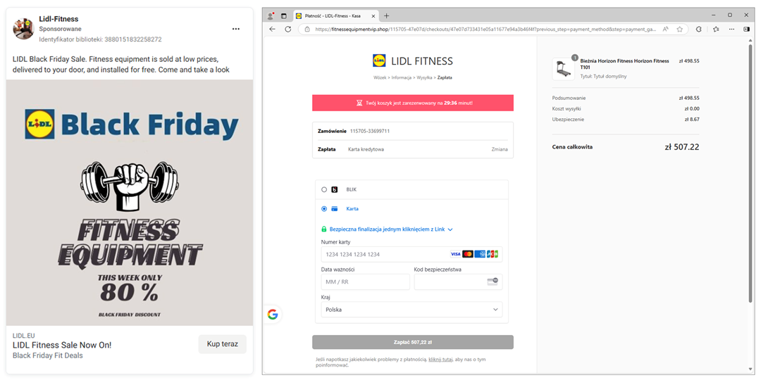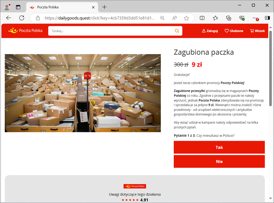 Once again, cybercriminals attempted to siphon funds from accounts using a "subscription model." This time, they published ads on the Facebook platform, claiming that users could purchase an unclaimed package for only 9 PLN (fig. 8).