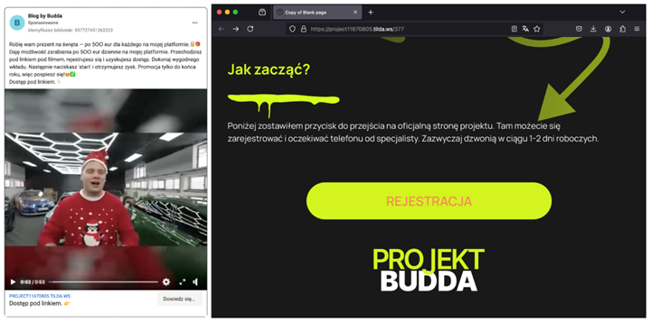 Przestępcy reklamując rzekome inwestycje wykorzystują często wizerunki znanych osób, wizerunki rozpoznawalnych firm oraz motywy rządowe. Nadal chętnie wykorzystują również technologię deepfake do tworzenia materiałów oszukańczych. Przedstawiona treść zachęca do rzekomych inwestycji (rys. 1-2).