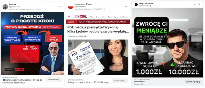 rys. 1 Fałszywe reklamy inwestycyjne dystrybuowane na platformie Facebook