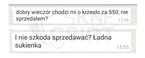 Kontakt odbywa się najczęściej poprzez komunikator WhatsApp, zdarzają się jednak również inne formy kontaktu przestępcy z ofiarą. Wystawiający ogłoszenie (ofiara) dostaje taką propozycję przeprowadzenia transakcji, w której będzie miał możliwość „odebrania zapłaty za przedmiot/usługę” (rys. 2).