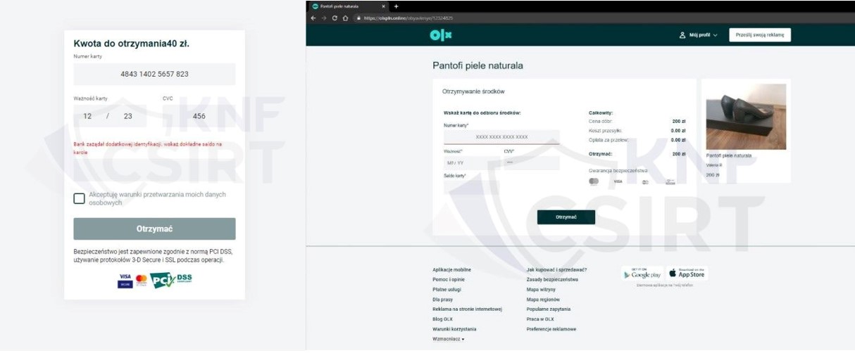 Przesłany na komunikatorze link przekierowuje do fałszywej strony podszywającej się pod serwis ogłoszeniowy/usługowy lub firmę kurierską. Drugi przypadek odbywa się pod pretekstem pośrednictwa w płatności firmy przewozowej. Po wejściu na stronę ofiara najczęściej widzi informacje ze swojego ogłoszenia, dane potencjalnego kupującego oraz proszona jest o wpisanie swoich danych osobowych oraz danych karty płatniczej, i/lub z kodem 3DSecure lub o podanie danych uwierzytelniających do bankowości elektronicznej, wraz z autoryzacją (SMS-Kod, podpis mobilny) (rys 4).